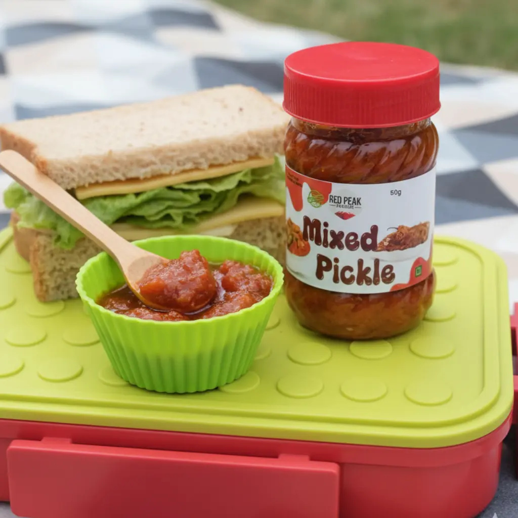 Our Traditional Homemade Mixed Pickle is a carefully crafted symphony of flavors, made with the finest sun-ripened mangoes, zesty lemons, crisp carrots, and a bold blend of green chillies and ginger. This isn’t just a condiment; it’s a jar of sunshine and spice that brings any dish to life.